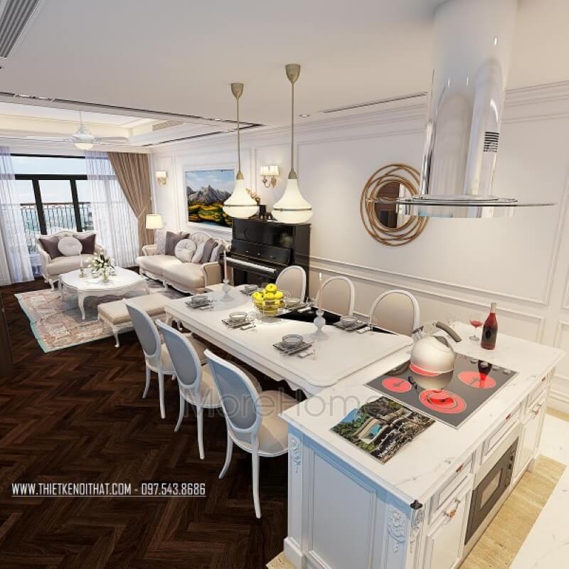 Tủ bếp màu trắng với những đường nét chạm khắc tinh tế, kết hợp nội thất nhà bếp hiện đại mang lại sự thuận tiện cho quá trình nấu nướng cho gia chủ