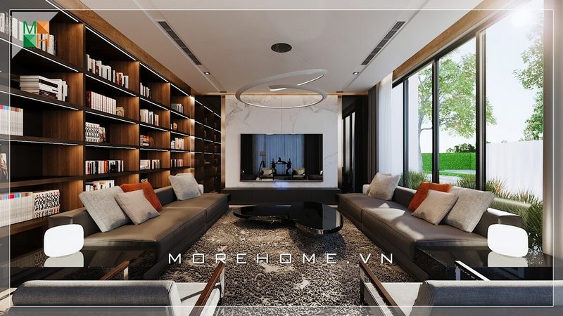 Không gian phòng khách biệt thự, nhà phố đầy ấn tượng với vẻ đẹp sang trọng, đẳng cấp của bộ sofa bọc da màu nâu trầm tinh tế được thiết kế theo phong cách hiện đại trẻ trung và kiểu góc tiện lợi.