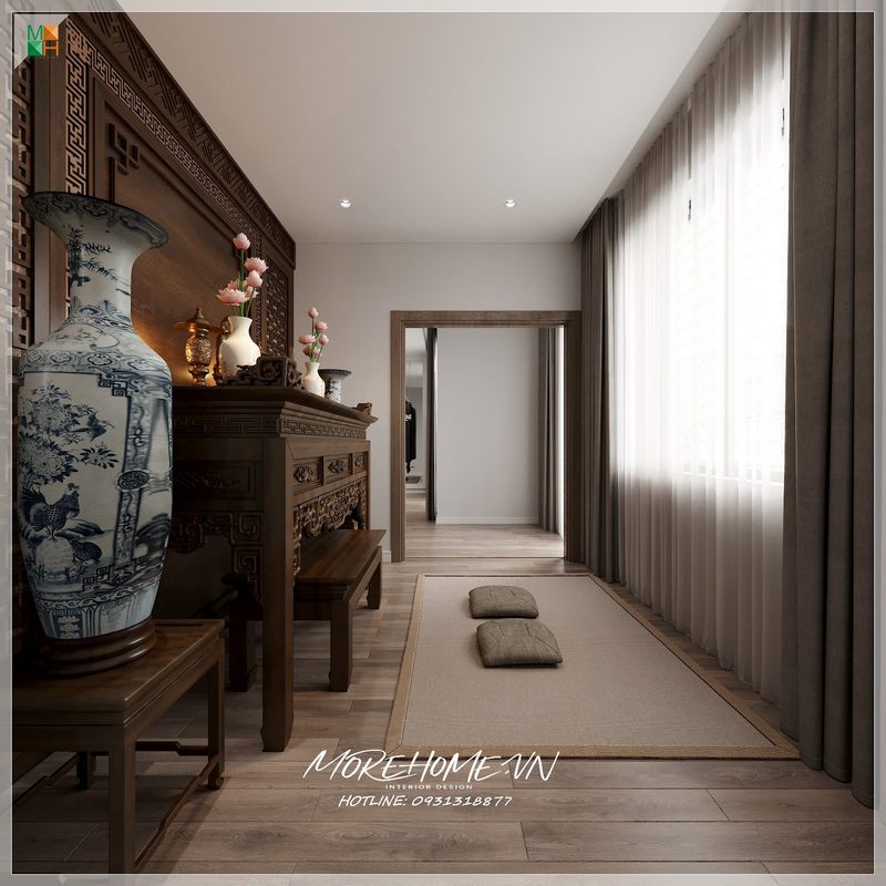 Theo quan niệm phong thủy, đặt bàn thờ ra cửa sẽ thoát khí tốt nhưng sẽ không mang lại may mắn cho gia chủ. Tuy nhiên, do diện tích phòng thờ hạn chế nên bàn thờ đã được che rèm hai bên phía trước.