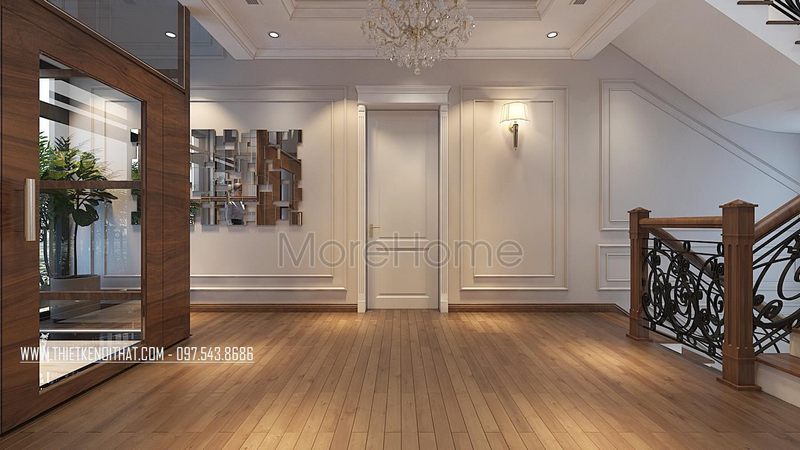 Mẫu cửa gỗ tân cổ điển màu trắng sang trọng khiến không gian nơi đây trở nên tiện nghi hơn.